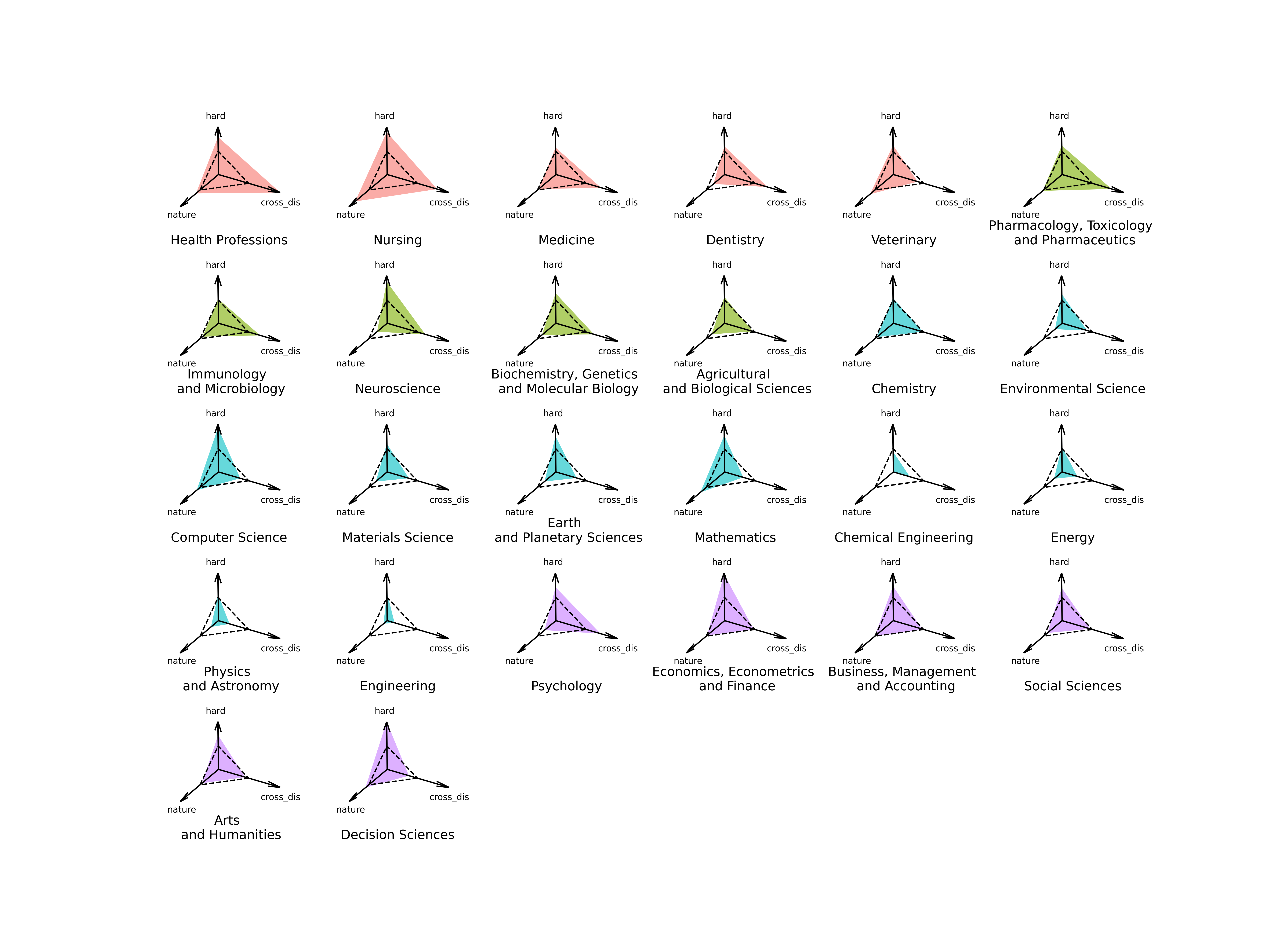 We measured the gender difference in subjects and races on the axes of interdisciplinarity, soft-hard, and nature-social based on the research topics of their papers. From the left picture, we can see that males perform harder in mathematics, computer science, and all of the social science fields. As for Health Professions and Nursing, Males' research is significantly harder and more cross-disciplinary. From the right picture, there are some race clusters of gender gap on these three axes.
