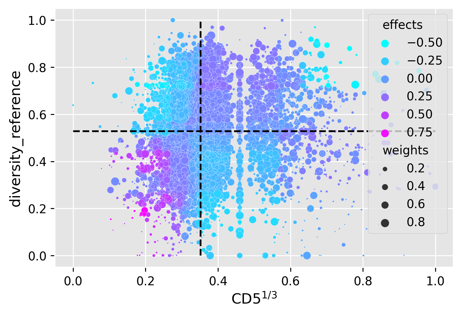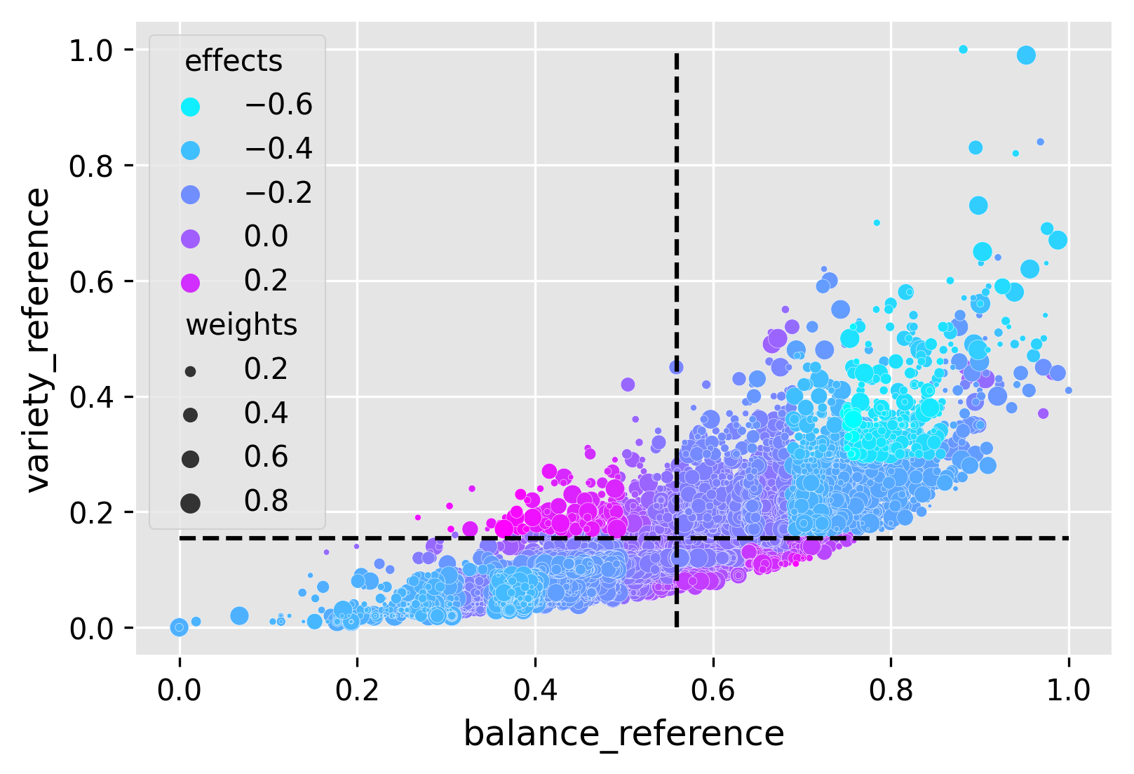 We developed early identification machine learning frameworks, analyzed feature importances, and both individual and interactive effects of originality metrics based on the constructed dataset using award-winning scientific achievements and a comprehensive literature database. The following pictures illustrate the interactive effects of reference-based variety and diversity (left), and diversity and disruption in the early period on originality.